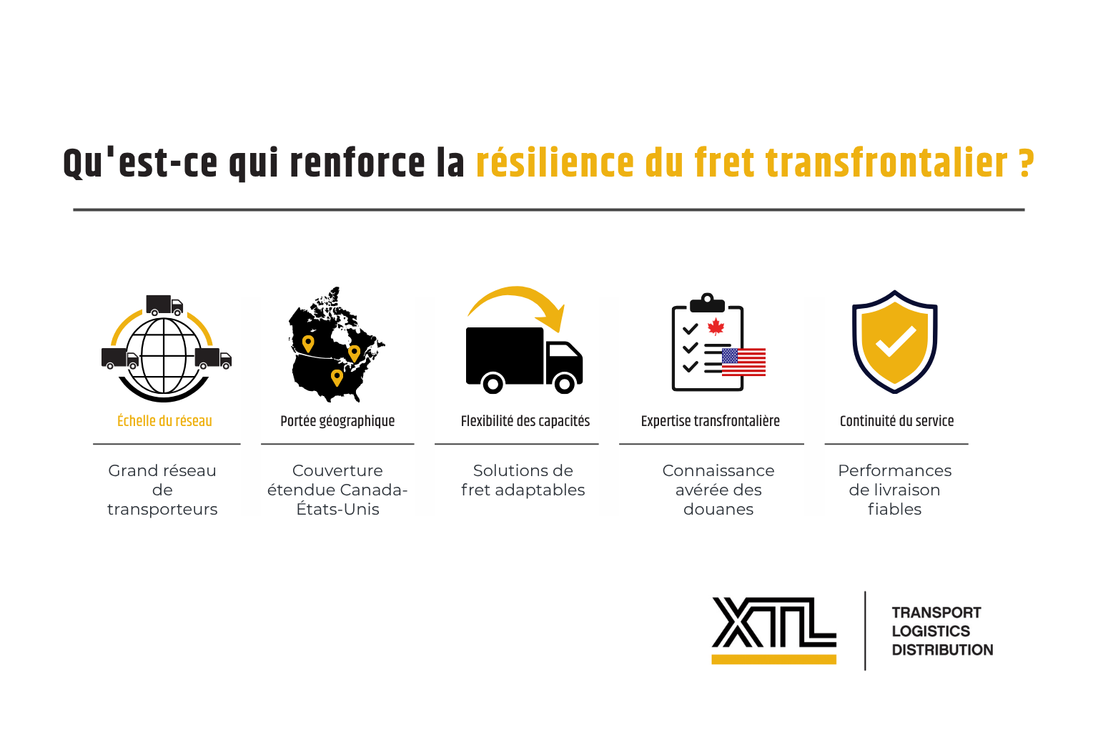 C’est là où XTL apporte une valeur concrète. Grâce à l’étendue de son réseau et à sa portée opérationnelle pour soutenir le fret partout au Canada et les expéditions transfrontalières vers les États-Unis, XTL aide les expéditeurs à bâtir des plans de transport transfrontalier conçus non seulement pour l’efficacité, mais aussi pour la continuité.